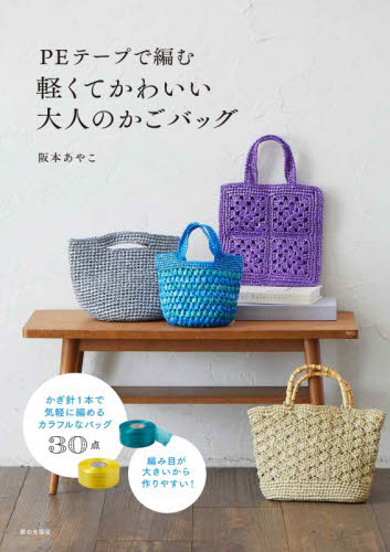 身近なPEテープ(ビニールテープ)を使って、かぎ針編みの基本テクニックだけで編むことができる30種類のバッグを紹介。身近なPEテープ(ビニールテープ)を使って、軽くて丈夫な大人のかごバッグが作れる! 本書では、かぎ針編みの基本テクニックだけで編むことができる30種類のバッグを紹介。編み目が大きく見やすいから、初心者でも失敗しづらく、短時間で完成します。カラフルなテープで作るバッグは着こなしのポイントになるだけでなく、汚れてもジャブジャブ洗えて使い勝手も抜群。低予算で作れるのも魅力です。エコな素材でバッグ作りを楽しみましょう。<br>阪本あやこ