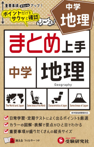 中学社会の地理の要点がひと目でわかります。消えるフィルターで繰り返し学習すれば,定期テストの得点アップは間違いナシ!○中学社会の地理をビジュアルな図解を用いながら簡潔に解説しました。カラーで見やすく,要点がひと目でわかるようにしています。<br>○単元の中での重要な事項をゴロ合わせで覚えられるようにしました。<br>○コンパクトな参考書なのでいつでもどこへでも携帯できます。また,消えるフィルターで何度でも繰り返し学習ができるので,きっちりマスターすることができます。<br>○章末に「まとめテスト」があり,どれだけ理解できたかすぐに確認ができます。<br>