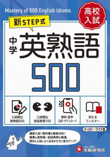 中学校で学ぶべき英熟語と入試問題でもよく出る英熟語を合わせた500の熟語を厳選した,基礎から難関校まで使える熟語集!・中学校と高校入試で必須となる500の英熟語を厳選してレベル設定を4段階とし,見やすくわかりやすい紙面としました。<br>・レベル1〜4の各 STEP を見開きページでまとめました。<br>・教科書や入試でも狙われやすい,重要な会話表現については,機能と場面に区別して,100の表現をまとめました。<br>・例文は中学生が学びやすい難易度に設定しています。また会話表現では,人物A・人物Bの対話を例文として掲載しているので,場面を理解しつつ,学習することが可能です。<br>・消えるフィルターを使うと,赤字をかくしながらの学習も可能で,くり返し何度でもチェックすることができます。<br>・QRコードを読み取ればスマートフォンなどでも,英単語,日本語訳,例文の音声を聞きながら学習することも可能です。データはホームページからもダウンロード可能です。<br>