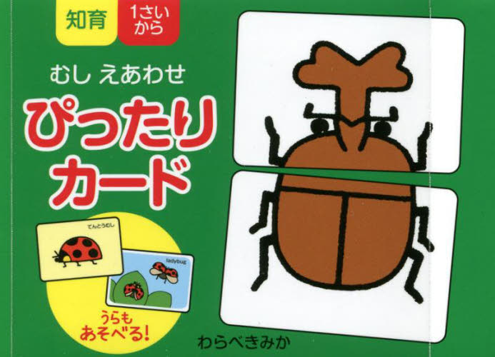 家庭、園で親しまれてきたロングセラー、わらべきみかの「ぴったりカード」シリーズに、カラフルな「むし」が仲間入り!家庭や幼稚園、保育園で長年親しまれてきた累計80万部越えのベストセラー、わらべきみかの「ぴったりカード」シリーズにカラフルな「むし」が仲間入り! ちょうちょ、かぶとむし、ばった、だんごむし、こおろぎ……身近で人気の虫16種類を、2枚1組のカードをぴったり合わせて完成させよう! カードの裏は、虫の横姿と、自然に生息している姿の絵が楽しめます。虫に興味を持ち始めたお子さんにぴったり! お散歩や公園での虫探しがより楽しみになるか―ドです。<br>わらべ きみか