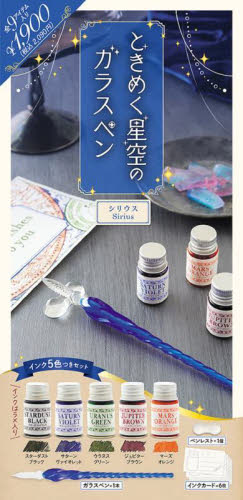 ときめく星空のガラスペン シリウス星空のガラスペン1本に、インク5本、インクカードやペンレストもついた全9アイテムのとってもお得なセット。<br>買ったその日から始められ、初めてのガラスペンにもぴったりです。<br>シリウスセットは深い青色のガラスをホワイトのガラスに巻いて仕上げた、冬の一等星をイメージした澄んだ青色のガラスペンを採用。<br>インクは深い夜の静けさにぴったりのシックな色を選びました。<br><br>インクラベルは、ガラスペンを使ったレタリングで活躍するハコペンさんが担当。<br>実際のインクで描かれたラベルで、とびきりの世界観を演出します。<br><br>◇◆セット内容◆◇<br>ガラスペン×1(シリウスカラー)<br>インク×5 ラメ入り<br> ・スターダストブラック<br> ・サターンヴァイオレット<br> ・ウラヌスグリーン<br> ・ジュピターブラウン<br> ・マーズオレンジ<br><br>ペンレスト×1<br>インクカード×6<br>