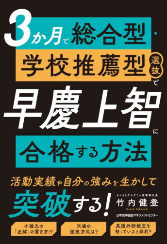 早稲田大学・慶應義塾大学・上智大学に総合型・学校推薦型選抜で合格するための方法を紹介!自分の強みを知り、合格しやすい試験を戦略的に選択して、合格を勝ち取る!今の自分にとって、受かるべくして受かる試験を探し出し、合格する。それが短期間で早慶上智に合格するために、最も重要なことです。<br><br>本書は、私立の難関大学である、早稲田大学・慶應義塾大学・上智大学に、総合型選抜・学校推薦型選抜(公募推薦)を活用して、合格を目指す受験生のための、受験戦略を紹介しています<br>自分の強みを生かし、アピールすることで、あこがれの難関大学に合格することも夢ではありません。そのため、自分の得意科目や高校生活での活動実績などを活用できて、倍率も有利な大学・選抜方式を選ぶことが大事です。また、小論文・志望理由書などの提出書類の準備の仕方や、過去問の傾向を把握し、対策することが欠かせません。本書ではそれら受験戦略を紹介しています。<br>竹内健登