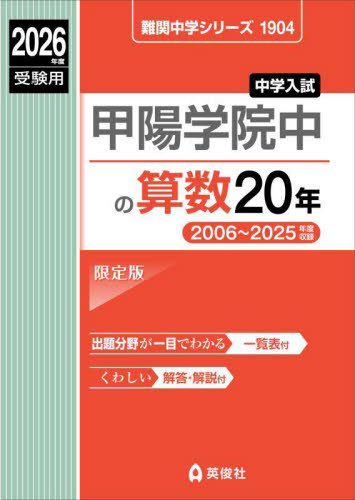 1.甲陽学院中の算数入試問題20か年(2006〜2025年)を完全収録。<br>2.出題分野が一目でわかる一覧表つき。<br>3.くわしい解説(別冊)。<br>