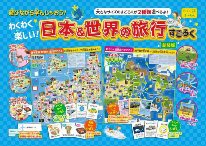 日本と世界のすごろく二つ楽しめます。すごろくは620×620mmのビッグサイズ!カードもあり、遊び要素がいっぱいです。日本は各地を回って名産物をゲットしながら進み、世界は飛行機や船に乗って名所を回ります。日本と世界のすごろく二つ楽しめます。すごろくは620×620mmのビッグサイズ!カードもあり、遊び要素がいっぱいです。日本は各地を回って名産物をゲットしながら進み、世界は飛行機や船に乗って名所を回ります。すごろくを楽しみながら、いろいろと学ぶこともできます。お友達やご家族と楽しんでください。<br>
