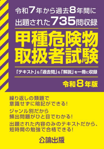 令和7年から過去8年間に出題された735問を収録しています。<br><br>危険物取扱者試験は、多くが過去に出題された問題から繰り返し出題されています。<br>そのため、過去問題を効率よく解き、その内容を覚えることが試験合格への近道と私たちは考えています。<br><br>本書は、〔過去問題〕を解く上で必要となる覚えるべき内容を〔テキスト〕にまとめ、〔過去問題〕を解いた後の「なぜ?」「どうして?」に対応するよう〔正解と解説〕を備えています。<br>項目ごとにまとまっているので頭の中で整理しやすく、「覚える」→「問題を解く」→「正解・解説を確認する」→「覚える」を繰り返すことで、意識せずに覚え、解くことができます。また、何度もチャレンジすることで、試験に合格する力が身につきます。<br>
