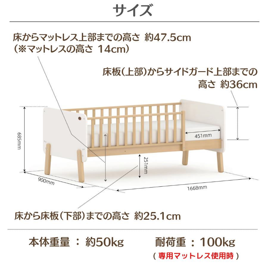 | その他のサイズ | ・床からマットレス上部までの高さ 約47.5cm ※マットレスの高さ 14cm ・床から床板(下部)までの高さ 約25cm ・床板(上部)からサイドガード上部までの高さ 約36cm |