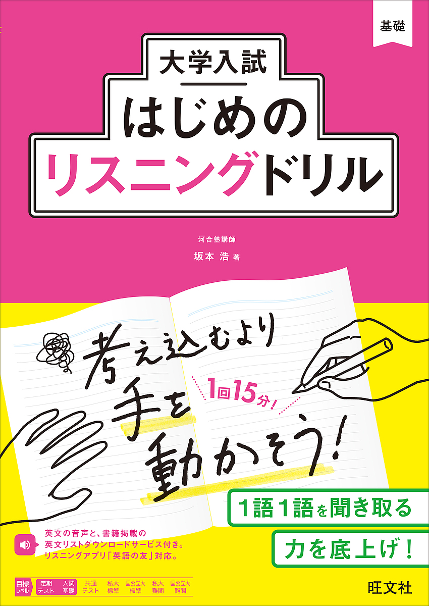 本書『はじめのリスニングドリル』は,ディクテーションを集中的に行うことでその変換をスムーズに行えるようになるための1冊です。短いシンプルなものから長い文や複雑な構成のものへとステップアップしながら,聞き取りのプロセスを自動化していきましょう。