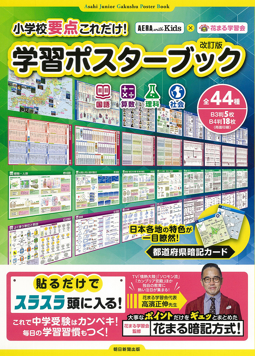 地図や年表、公式集など、国語・算数・理科・社会の重要項目をまとめたB3、B4サイズのポスターが全23枚入っています。リビングや子ども部屋の壁、学習机と透明デスクマットの間など、あらゆる場所で繰り返し見ることで要点が頭に入ります。切り取り式の都道府県カード付き。2018年版を改訂し、最新データやトピックも掲載しました。入試対策に、日々の学習の手助けに、フル活用できるポスターブックです。