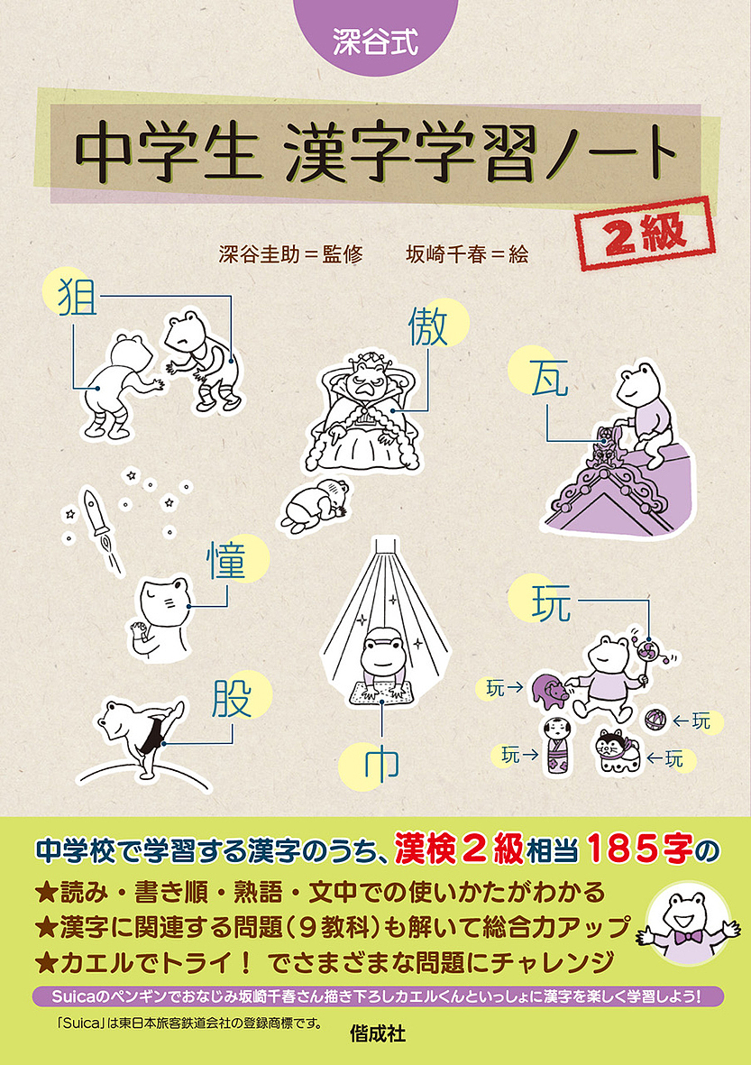 中学生が習う漢字(小学校で習う学習漢字1026字以外の常用漢字1110字)を対象とした、「辞書引き学習」の深谷圭助氏の監修、「Suicaのペンギン」の坂崎千春さんのイラストによる新しい形式の漢字ドリル。