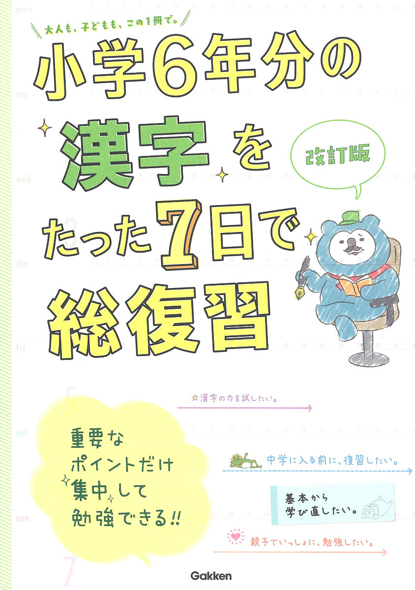 1週間で、一生役立つ漢字力が身につきます。集中して取り組める小テスト形式の問題と、役立つ漢字コラム、パズルや読み物つきで、苦手な人でもどんどん進められます。中学入学前の復習、大人の学び直しにも役立ちます。人気シリーズの改訂版。