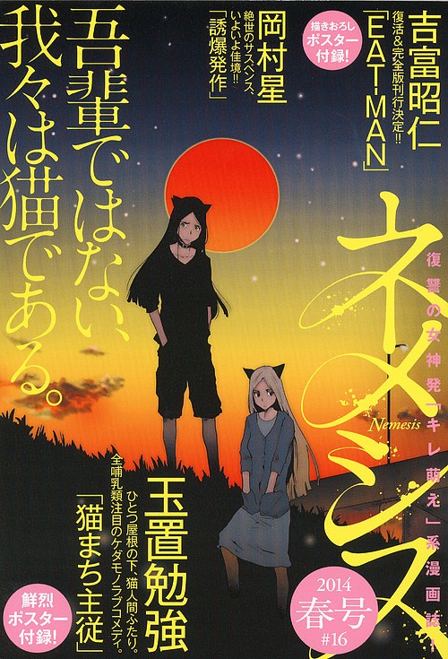 春ですよ。獣(ケダモノ)めいてきませんか? 復讐の女神発「キレ萌え」系漫画誌、第16号。『ちっくたっく』『親父の愛人と暮らす俺』の玉置勉強が描くケダモノラブコメディ『猫まち主従』が表紙&ポスター付録! 『地球の放課後』『スクール人魚』の吉富昭仁が描く、あの『EAT-MAN』描きおろしポスターが付録に! 『無限の住人』の沙村広明が描くずべ公アクション『ベアゲルター』は絶好調連載。既刊大重版の傑作サスペンス『誘爆発作』、佳境へ。気鋭の新人・皆本形介によるドタバタ短編『ウルフル』が特別読み切り掲載!!