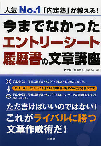 キーワード:今までなかったエントリーシート・履歴書の文章講座人気No.1「内定塾」が教える!高嶌悠人宮川洋 いままでなかつたえんとりーしーとりれきしよのぶんし イママデナカツタエントリーシートリレキシヨノブンシ たかしま ゆうと みやがわ よ タカシマ ユウト ミヤガワ ヨ