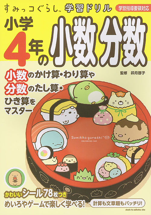 小学生女子に人気の「すみっコぐらし」のキャラと、小4の小数・分数を楽しく学習できるドリル。シール付き。