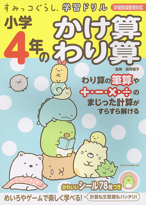 小学生女子に人気の「すみっコぐらし」のキャラと、小4のかけ算わり算を楽しく学習できるドリル。シール付き。