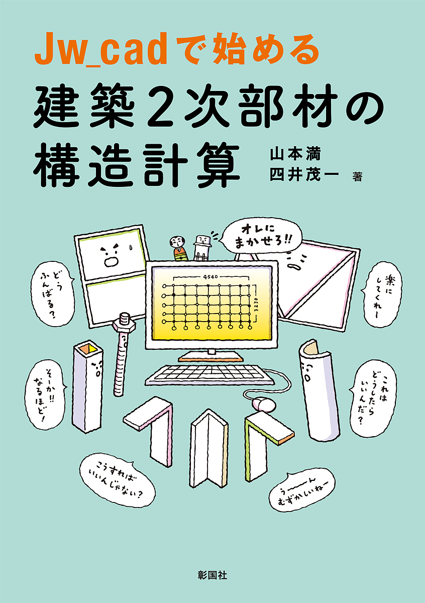 あなたの設計した建物の手摺、下地、重量物を載せた架台、天井の吊り具、サッシなど大丈夫ですか?Jw_cadで作図しながら建築2次部材の構造計算ができます。作図の過程で十分な部材のサイズを知ることができます。まず、本を買って、計算ソフトをダウンロードしましょう。