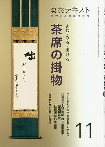 掛物をよんでみよう(茶道資料館顧問・筒井紘一氏/茶道資料館学芸課長・橘 倫子氏)では、毎月8幅の掛物を紹介。今月の漢字のくずし字は「透・過・関・是」、仮名は「片仮名・合字」/名幅拝見──鑑賞の心得(茶道研究家・小田達也氏):「画賛2」(画賛を鑑賞する際の心得について、Q&Aをまじえながらわかりやすく解説した上で、二幅の名幅を誌上でゆったりと鑑賞します。)/取り合わせと掛物(小林宗津氏):「炉開き」(掛物と取り合わせに寄せる亭主の思いを語るリレー連載。待合掛と本席掛のバランス、床の間との釣り合いなども紹介します)。