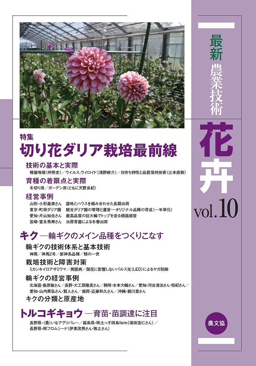 今号は切り花ダリアを特集した。ブライダルなど業務需要から、ここ数年一般向けのカジュアルフラワーとして広がってきている切り花ダリア。健全な種苗の確保や日持ち対策、冬切り作型のつくりこなしなど、ダリア栽培の課題に向けた最新研究と経営事例を特集。そのほか、輪ギクのメイン品種のつくりこなしと経営事例、トルコギキョウでは育苗・苗調達に注目した経営事例を収録した。