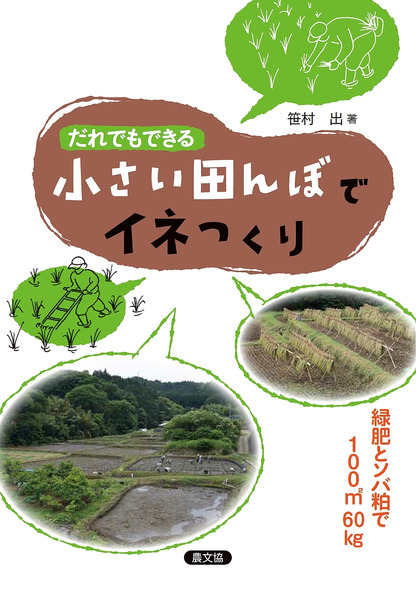 小さい田んぼを借りて始める人に。学校田にかかわる人に。農家が読んでもおもしろい!小さい田んぼだからこそ、楽しみながらたくさんとりたい。手間をかけるところにはかけ、ラクできるところはラクをして、100m2 60kgとれる技術を公開。そのコツは、ソバ粕(米ヌカでも可)で草を抑えること。冬は緑肥(レンゲや菜の花など)を育てて田んぼを裸にしないこと。