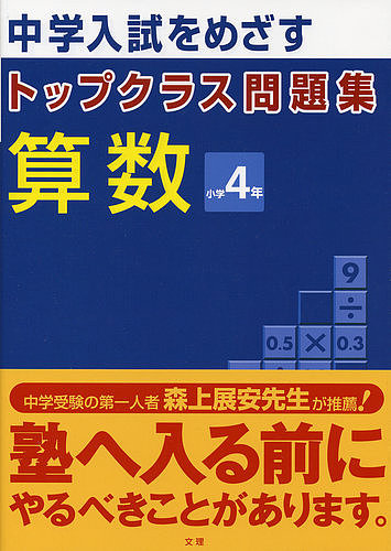 中学入試をめざす 小学4年生用問題集実力養成から入塾準備まで最良の1冊/実戦力が高まる「総仕上げテスト」/家庭学習にぴったりのくわしい解答・解説●本書は,トップクラスの学力をつけることを目的に作られた,小学校4年生用問題集です。●標準クラス(教科書レベル)の問題を基本に,ハイクラス・トップクラスと段階を積み重ねることによって,高い学力が身につくような構成になっています。●中学入試を研究し,それに基づいたパターンの問題を収録してあります。●教科書の単元にそって,その単元で学習できる内容の最高レベルまでの問題を収録してあります。●後半では,上の学年の内容を先取りして学ぶことができます。●中学入試に出される特殊算のうち,出題されるものの多くを掲載しました。●別冊の「答えと解き方(考え方)」は,各問題の解き方・考え方はもとより,その着眼点や指導の際の注意点もていねいに解説されています。どの問題も確実にできるようになることをめざしました。●「総仕上げテスト」は,やったあと,文理ホームページ上にて『学力診断』ができるようになっています。お子様の今の学力を知る一助になります。