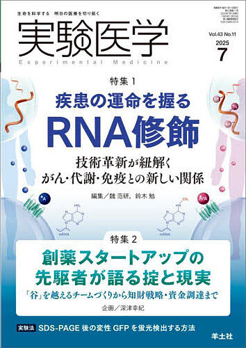 特集1:1つのRNA修飾で疾患の発症・悪化が左右される? ゲノムと表現型のギャップを説明するRNAの質的変化とその働きが,最新技術の応用で明らかになる!/特集2:その研究を薬に繋げるために….ベンチャー設立,企業連携の前に知っておきたい,現場の掟と本音を聞いてみた!