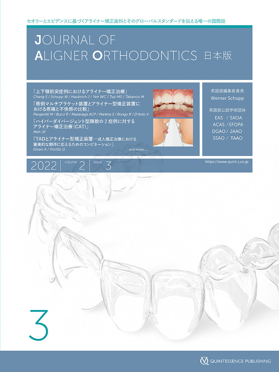 日本に、さらに質の高いアライナー矯正治療を根づかせるために。 本誌は、先人たちの積み重ねによって確立されてきた矯正歯科のセオリーとエビデンスに基づいたアライナー矯正治療のあり方を伝える「Journal of Aligner Orthodontics (JAO)」の日本版である。矯正歯科臨床に携わるすべての歯科医師、および新しい矯正歯科の治療技術に興味のある歯科医師向けに、原版翻訳ページにて日本の臨床家が目指すべき世界レベルのアライナー矯正治療の技術と知識を、日本版オリジナルページにて日本の現場で使えるアライナー矯正治療のオプションや実際をお伝えする。