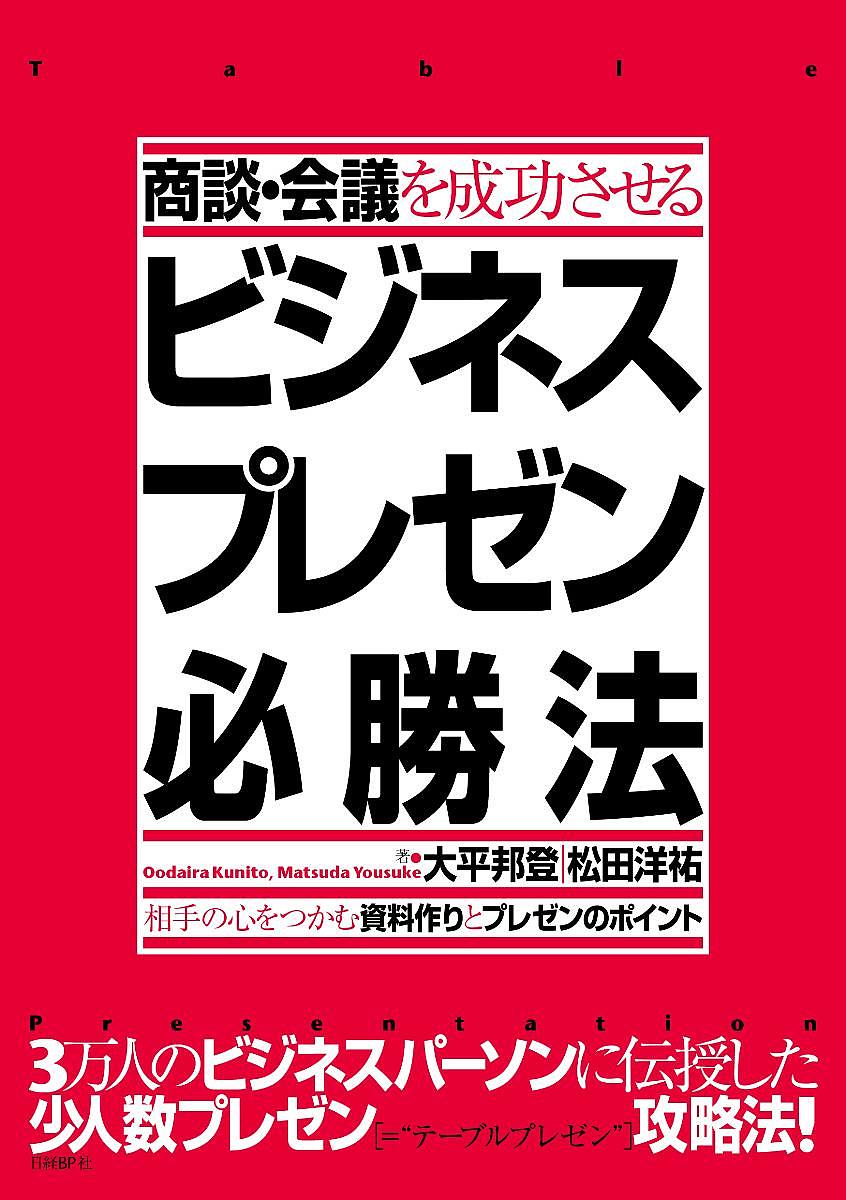本書は、比較的少人数(1〜5名程度)の聴き手を対象に、机をはさんで着座したポジションで紙の資料あるいはPCなどを使って行うプレゼンテーションをいかに効果的に行うかを解説しています。本書の中ではこうした対面の少人数プレゼンのことを“テーブルプレゼン”と呼んでいますが、大部分のビジネスパーソンが経験するもっとも一般的なプレゼンです。大きな講演会場で大勢を対象にするプレゼンとは異なり、少人数向けのプレゼンにはそれ独特のコツがあります。本書が説明しているのは、まさにその少人数向けの“テーブルプレゼン”について、立案から資料作り、さらには実際のプレゼン場面での表現態度まで、さまざまな観点からアドバイスを行っています。