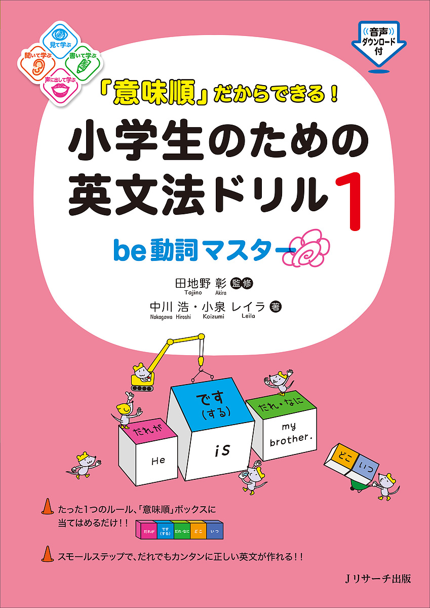 難しい文法用語を使わない5つの「意味順」ボックスに英語を書き込んでいくだけなので、小学生でも抵抗なく取り組め、自然に英語の語順感覚を身につけることができます。「意味順」ボックスは5色で色分けされており、視覚的にもわかりやすいです。本文は、まず単語からなぞり、「意味順」ボックスでの文法理解、イラストと文との照合、単語を選んで文を書いていくという4つのスモールステップで進んでいきます。本書ではbe動詞をメインに扱っていますが、一つ一つのレッスンがかなり易しいレベルなので、初めての子でも英語が書けるようになります。また、かわいいイラストもたくさん使われているので飽きずに取り組むことができます。