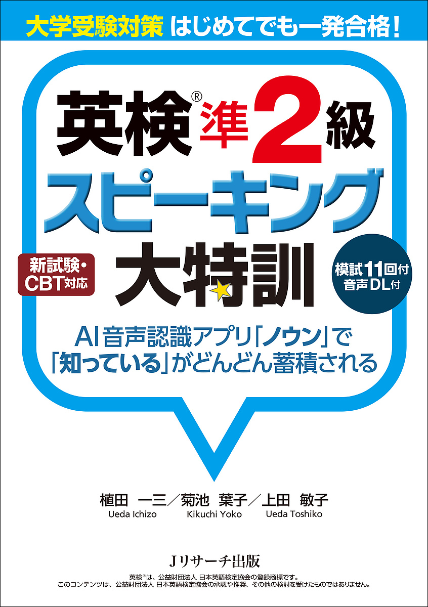 最新傾向に絞り込んで特訓できる本格派・スピーキングテスト(面接)対策。音読練習から短文練習、模試へと段階的にトレーニングできる。例文の丸暗記ではなく、自分の意見を論理的に言う力が身につく。減点されやすい発音・アクセントも音声でしっかりチェックできる。模擬試験11回分収録。AI音声認識アプリ「ノウン」を使って発音判定までカバーできる。
