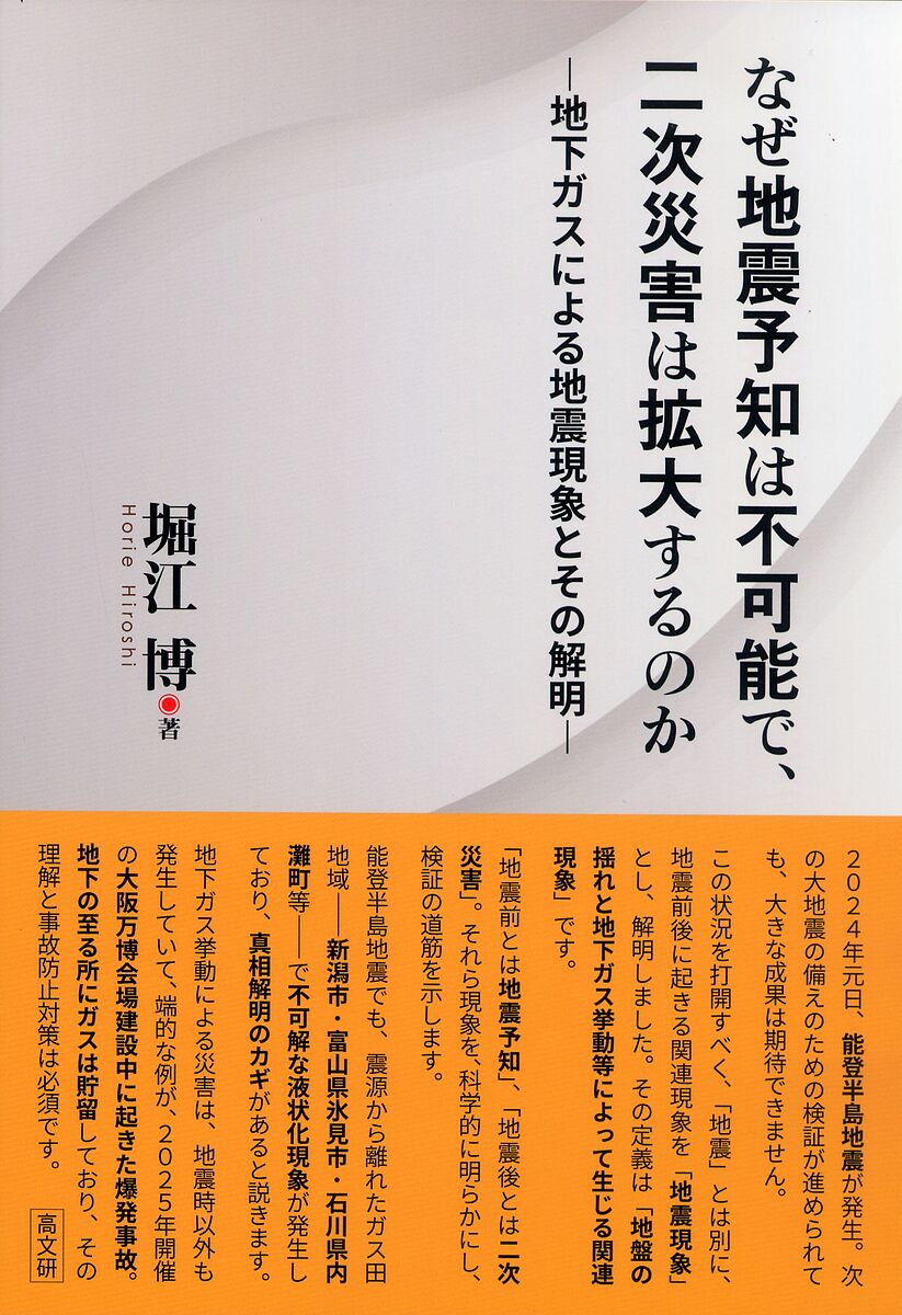 2024年元日、能登半島地震が発生。次の大地震の備えのための検証が進められても、大きな成果は期待できません。この状況を打開すべく、「地震」とは別に、地震前後に起きる関連現象を「地震現象」とし、解明しました。その定義は「地盤の揺れと地下ガス挙動等によって生じる関連現象」です。「地震前とは地震予知」、「地震後とは二次災害」。それら現象を、科学的に明らかにし、検証の道筋を示します。能登半島地震でも、震源から離れたガス田地域―新潟市・富山県氷見市・石川県内灘町等―で不可解な液状化現象が発生しており、真相解明のカギがあると説きます。地下ガス挙動による災害は、地震時以外も発生していて、端的な例が、2025年開催の大阪万博会場建設中に起きた爆発事故。地下の至る所にガスは貯留しており、その理解と事故防止対策は必須です。