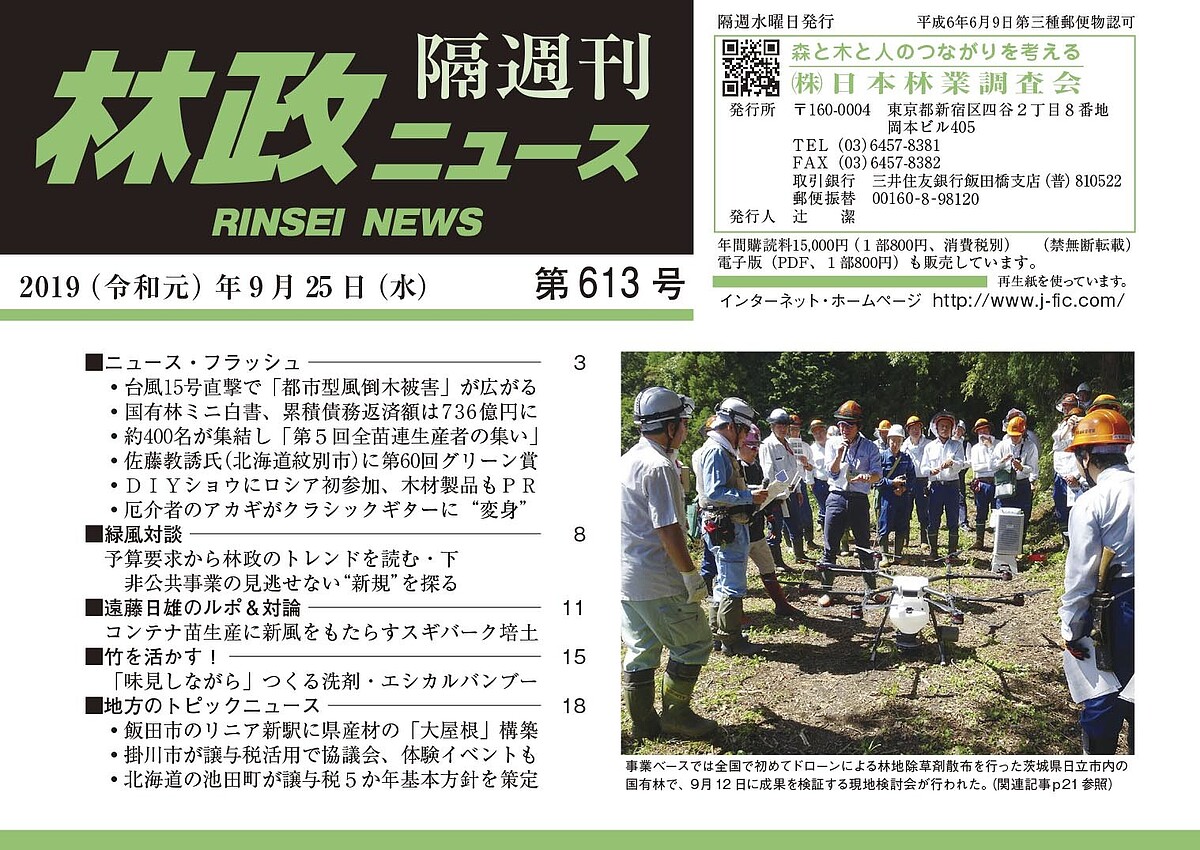 第613号は、「都市型風倒木被害」が深刻に/コンテナ苗に新風もたらすスギバーク培土/「味見しながら」竹からつくる洗剤が好評/林地除草剤をドローンで散布した結果を検証──などを掲載しています。