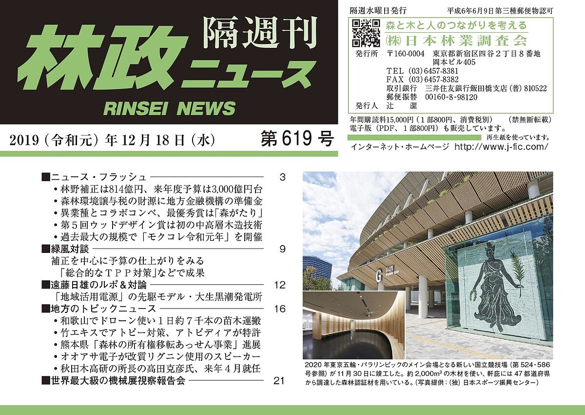 第619号は、森林環境譲与税の財源に地方金融機構の準備金活用/林業+異業種チームの初コンペで「森がたり」が最優秀賞/「地域活用電源」のモデル・大生黒潮発電所/ドローンで1日約7千本の苗木運搬可能に/4年に一度の世界最大級機械展から見えたものは?──などを掲載しています。