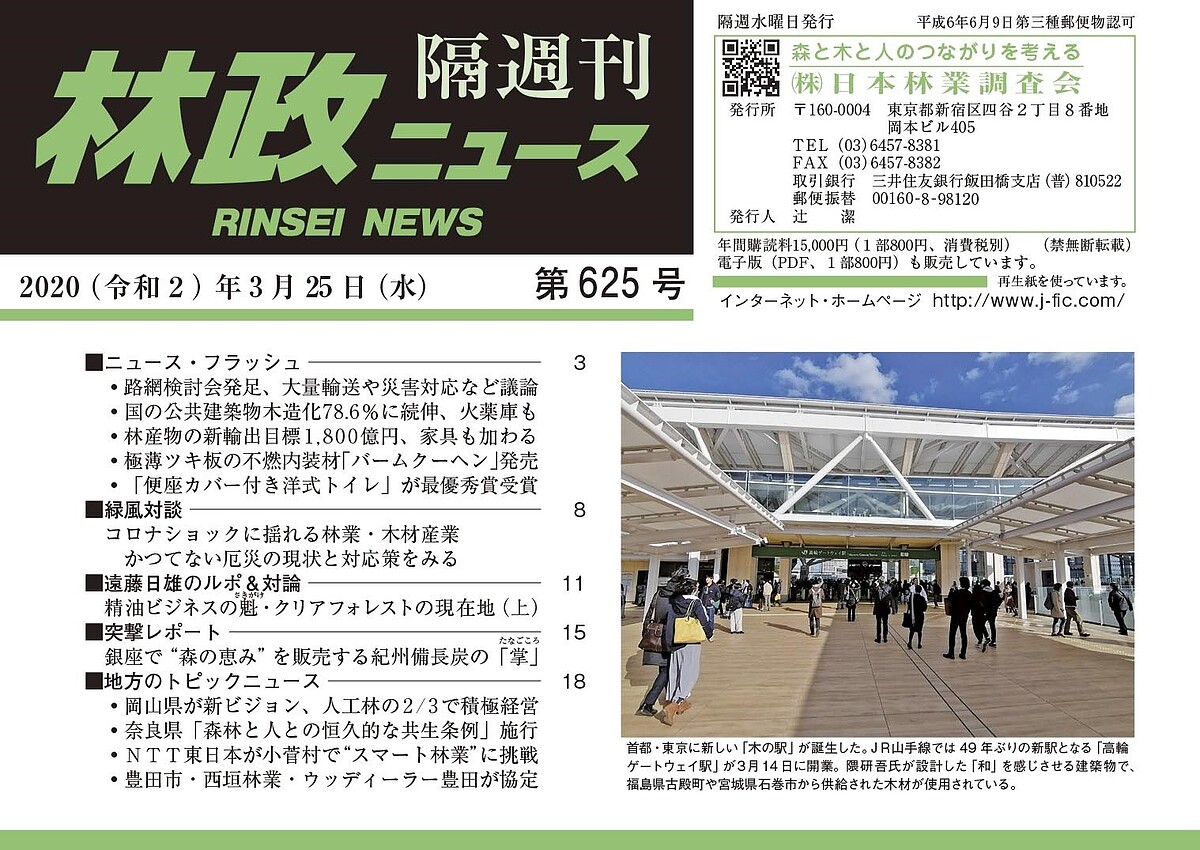 第625号は、路網整備の新ビジョン策定へ検討開始/林産物の30年輸出目標を1,800幾円に引き上げ/コロナショックに揺れる林業・木材産業/銀座で紀州備長炭を販売して20年の「掌」/奈良県が「森林と人との恒久的な共生」条例施行/NTT東が小菅村で“スマート林業”に挑戦――などを掲載しています。