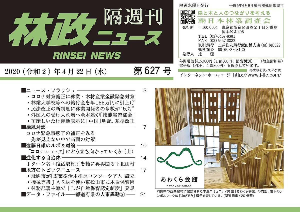 第627号は、コロナ補正で林業・木材産業金融緊急対策/林業大学校等への給付金を5万円引き上げ/菌床しいたけの産地表示に「中国」明記/「コロナショック」にどう立ち向かっていくか/Iターン者+復活製材所を軸に再興図る下北山村/飛騨市が「広葉樹活用コンソーシアム」設立――などを掲載しています。