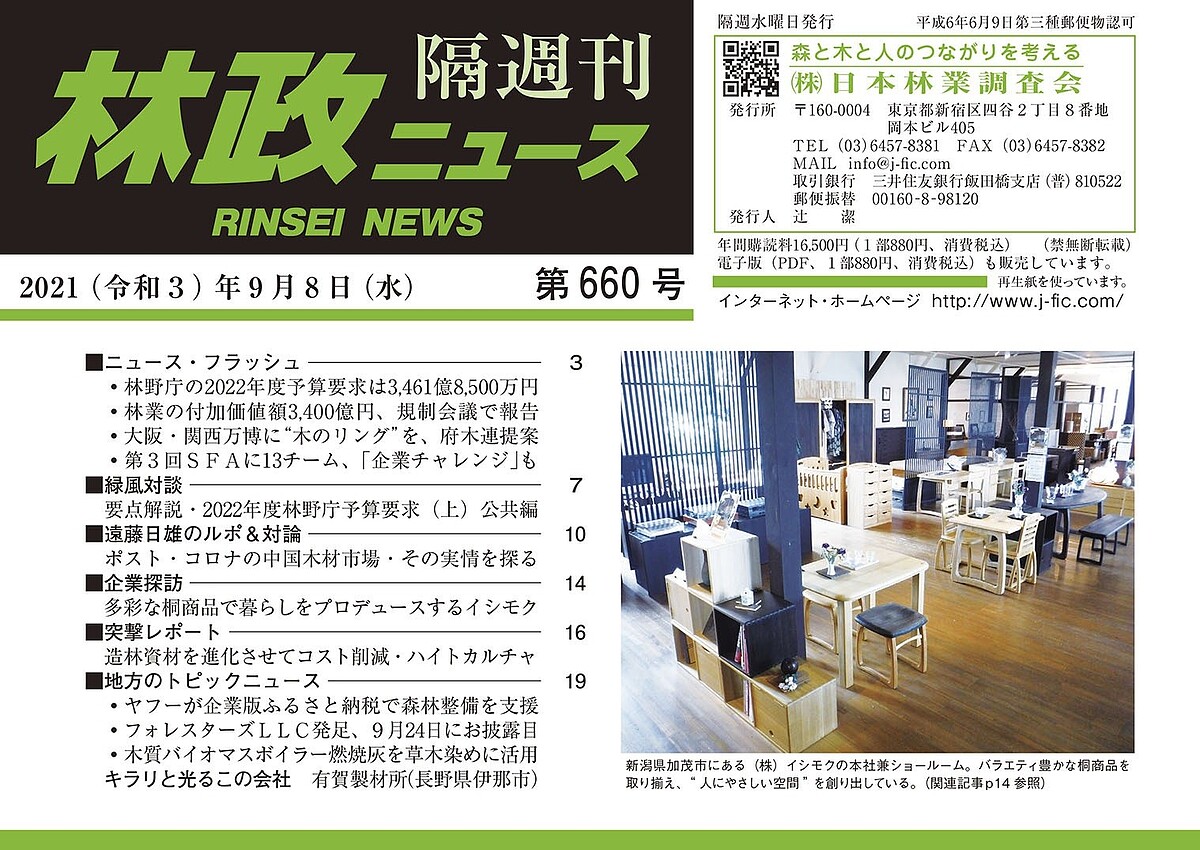 第660号は、林野庁の2022年度予算要求は約3,462億円/林業の付加価値生産額が3,400億円に増加/「小渕基金」を支えた日中緑化委の事業が終了/多種多彩な桐商品で暮らしをプロデュースするイシモク/造林資材を進化させて低コスト林業に挑むハイトカルチャ/ヤフーが企業版ふるさと納税で森林整備支援/木質バイオマスボイラー燃焼灰を草木染めに活用――などを掲載しています。