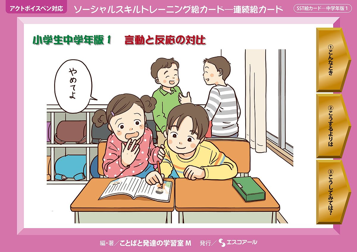 『ソーシャルスキルトレーニング絵カード 小学生中学年版1』は、ある場面での二通りの言動とそれへの反応を対比させる構成になっています。その子の言葉や行動次第で相手の反応が違ったり変わったりします。1枚目の絵カードで提示した場面に対して、2枚目の絵カードではこうしているけれど、3枚目のような方法もあることを知らせ、「こんなとき」には「こうするよりは」「こうしてみてはどうだろう?」と提案をする形を取っています。