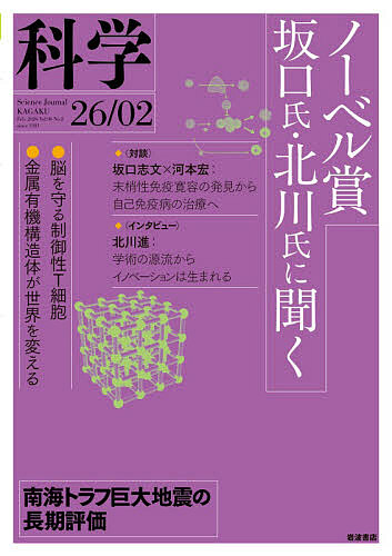 【特集】ノーベル賞坂口氏・北川氏に聞く〈対談〉 末梢性免疫寛容の発見から自己免疫病の治療へ……坂口志文・河本 宏〈インタビュー〉 学術の源流からイノベーションは生まれる……北川 進[ノーベル生理学・医学賞2025]制御性T細胞による末梢性免疫寛容の仕組みの解明2──免疫学の歴史における20世紀最後の大発見……河本 宏・西村有史制御性T細胞の“マスター転写因子” Foxp3の発見とそのインパクト……堀 昌平脳を守る制御性T細胞……伊藤美菜子・吉村昭彦坂口イズム……伊藤能永ストックホルムで坂口先生の授賞式に参加して……山崎小百合幸運のpay it forward……前田優香[ノーベル化学賞2025]金属−有機構造体MOFがもたらしたものと現在地……堀毛悟史ナノ空間での高分子化学……植村卓史気体を抱えて,世界を変えた材料──「最初の多孔性金属錯体」にまつわる30年史……坂本裕俊[巻頭言]智の広がりを喜ぶ──坂口先生と北川先生のノーベル賞ご受賞に寄せて……大隅良典[解説]オスヤドカリのメス化を誘導するフクロムシの繁殖戦略……梶本麻未[連載]因果をめぐる7の視点2 ビッグデータ時代のスモールデータ──説明から納得,そして活用へ……樋口博之ウイルス学130年の歩み8 インフルエンザウイルス,デングウイルス,コロナウイルス……山内一也カミオカンデはいかに生まれたのか──基礎科学の曲がり角に立って5 巨大な光検出器で仕掛けた「ゲリラ戦」……古川雅子野球の認知脳科学9 「わかっていても打てない」とは?……柏野牧夫[フォーラム]南海トラフ巨大地震の長期評価を読み解く──改訂された評価の意味と今後の課題……平田 直次号予告表紙画像=(上)伊藤美菜子・吉村昭彦:「脳を守る制御性T細胞」図1より,(下)植村卓史:「ナノ空間での高分子化学」図3より表紙デザイン=佐藤篤司