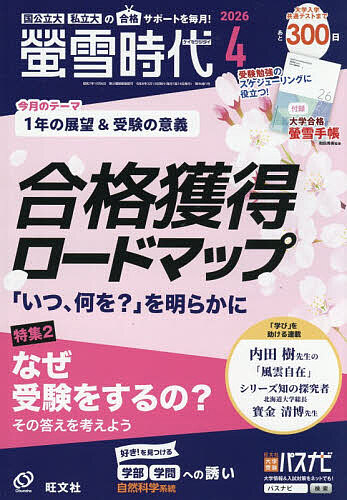 特集1◆いつ・何を・どうする? 大学合格へのロードマップ PART1:一般選抜・学校推薦型・総合型選抜 PART2:英語・数学・国語◆早めがカギ! 勉強習慣をつくろう◆時期によって変わる過去問の使い方◆【高校生活+受験勉強】毎月の優先課題はこれ!◆先輩たちの歩んだ「学参ルート」特集2●「なぜ受験するのか?」を明確にし、一歩を踏み出そう!●「やりたいこと」の答えは自分の中 自己理解メソッド●先輩が大学で見つけた 大学入学の意義●コバショー(小林尚先生)に聞く! 高校・受験、大学、社会 それぞれの勉強の意味