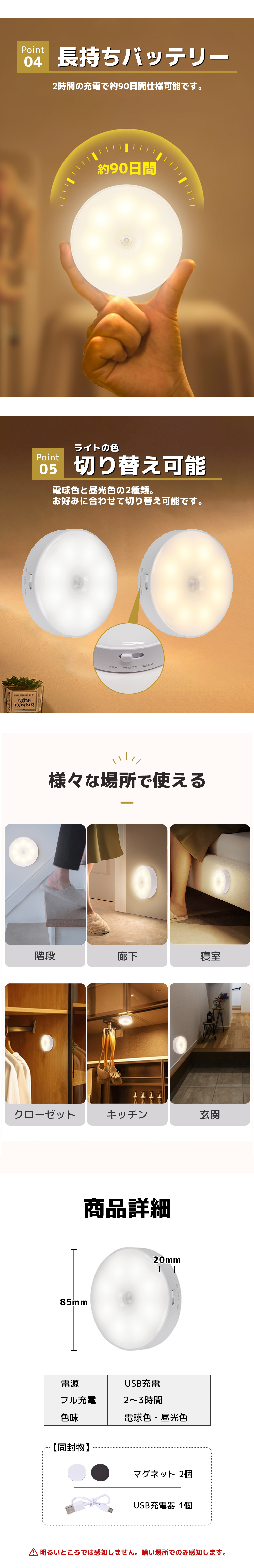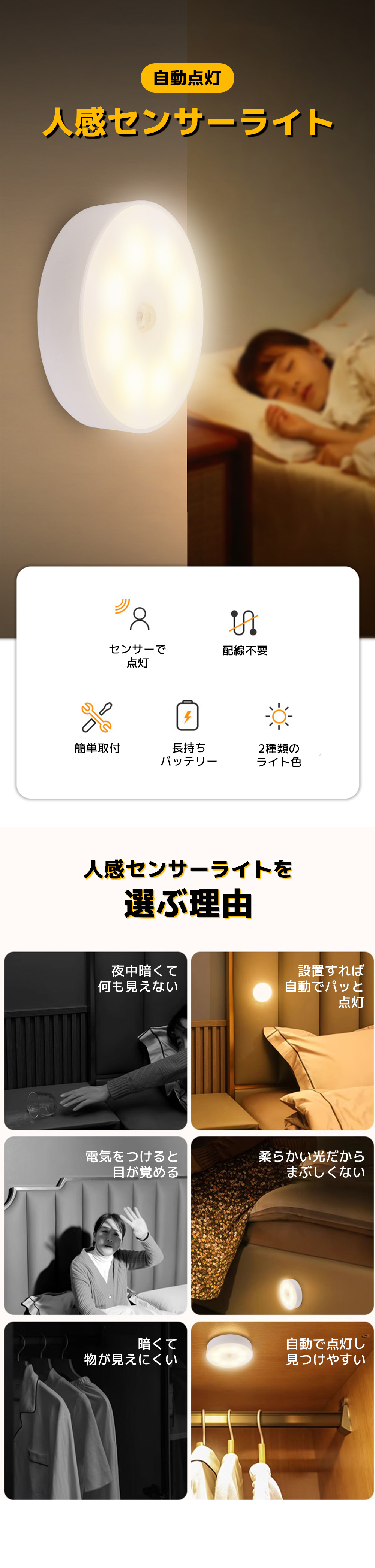 人感センサーライト 2個セット 自動点灯 自動消灯 2色調光 充電式 コードレス 照明 ナイトライト 簡単設置 足元灯 玄関 廊下 階段 クローゼット 室内照明