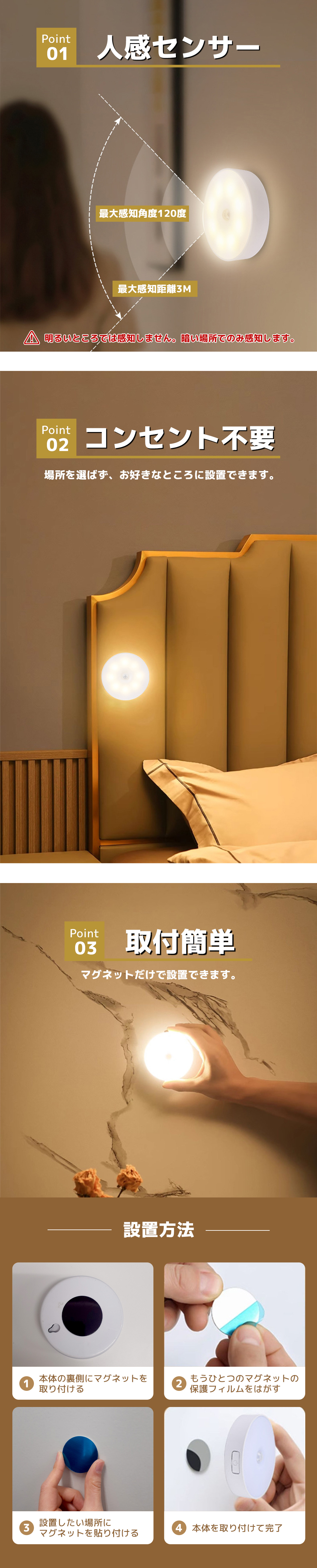 コンセント不要・配線いらずのUSB充電式で、設置場所を選ばず、階段・廊下・玄関・クローゼットなど、さまざまな場所で手軽に使用できます。