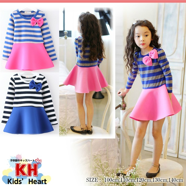 新作子供服 胸元リボン付き 身頃ボーダー柄 ワンピース 長袖 春夏秋 結婚式/発表会/入園 入学式/卒業式/フォーマル 100cm 110cm 120cm 130cm 140cm オススメ