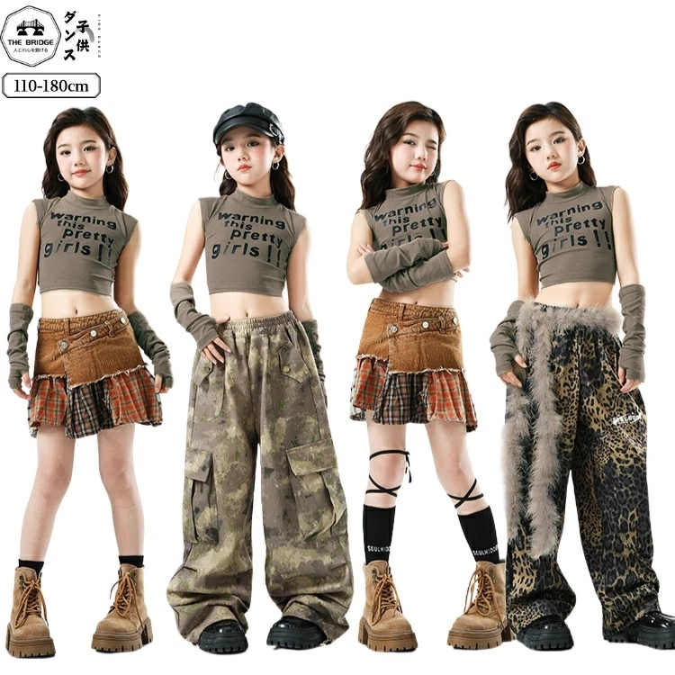 ダンス衣装 迷彩 キッズ ヒョウ柄 女の子 HIPHOP ダンス衣装 チェック柄 キッズ K-POP 上下セット ヒップホップ 韓国アイドル 腕カバー ヘソ出し スカート ゆっ
