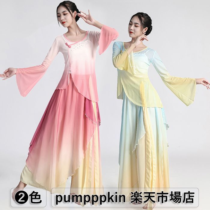 古典舞踊 グラデーション 古典ダンス衣装 レディース 中華風 舞台ステージ衣装 大人 子供 飄逸 チャイナ風 ひらひら ストレッチ ダンスウェア セットアップ ラッ