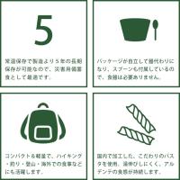 アルファ化米”マジックライス”の技術を持つ「サタケ」が、その技術をパスタに応用。湯伸びしにくく、アルデンテの歯ごたえを持った、本格パスタに仕上げました。被災時の厳しい状況でも、お湯を入れて付属のソースを絡めるだけで、美味しいパスタを食べることができたら、ホッと心も和み、少しゆとりを持てるのではないでしょうか。