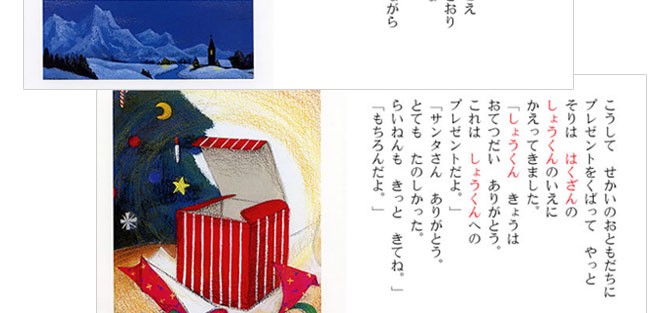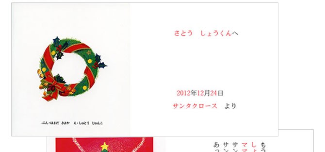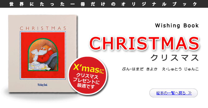 | オーダーメイド絵本 ウィッシングブック クリスマス CHRISTMAS 世界でたった1冊のオリジナル絵本。贈り物にいかがですか? オリジナル絵本ウィッシングブックは物語の主人公の名前が、プレゼントする相手やお子様、お孫さんの名前になる世界でたった1冊のオリジナル絵本です。 また贈る側(=贈り主)のメッセージも入れることができますので、記念日のプレゼントにピッタリです。 美しい絵と正しい日本語で印刷され、また主人公の名前が自分の名前になりますので、お子様も知らず知らずのうちに読書に興味を覚えるようになります。 【この本の特長】 主人公(プレゼントするお相手)がサンタクロースにお願いしたプレゼントは「サンタクロースと一緒にソリに乗って、お友達にプレゼントを配ること」。ファンタジックな絵と心なごむストーリーの幼い日の心ときめくクリスマスの物語です。 【おすすめシーン】 クリスマスプレゼントに最適! ※ご注意ください※ ご注文受付後、こちらから改めてストーリーデータご記入用のメールをお送りいたします。 「注文画面」でのストーリーデータのご記入はありませんので、ご注意ください。 | |||||||||||