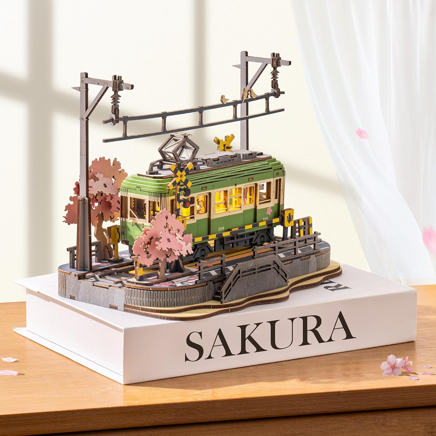 ROBOTIME 立体パズル 木製 3D ウッドパズル 桜の電車 LEDライト付き 組み立て 工作キット DIY クラフト メカニカル モデル 和風インテリア