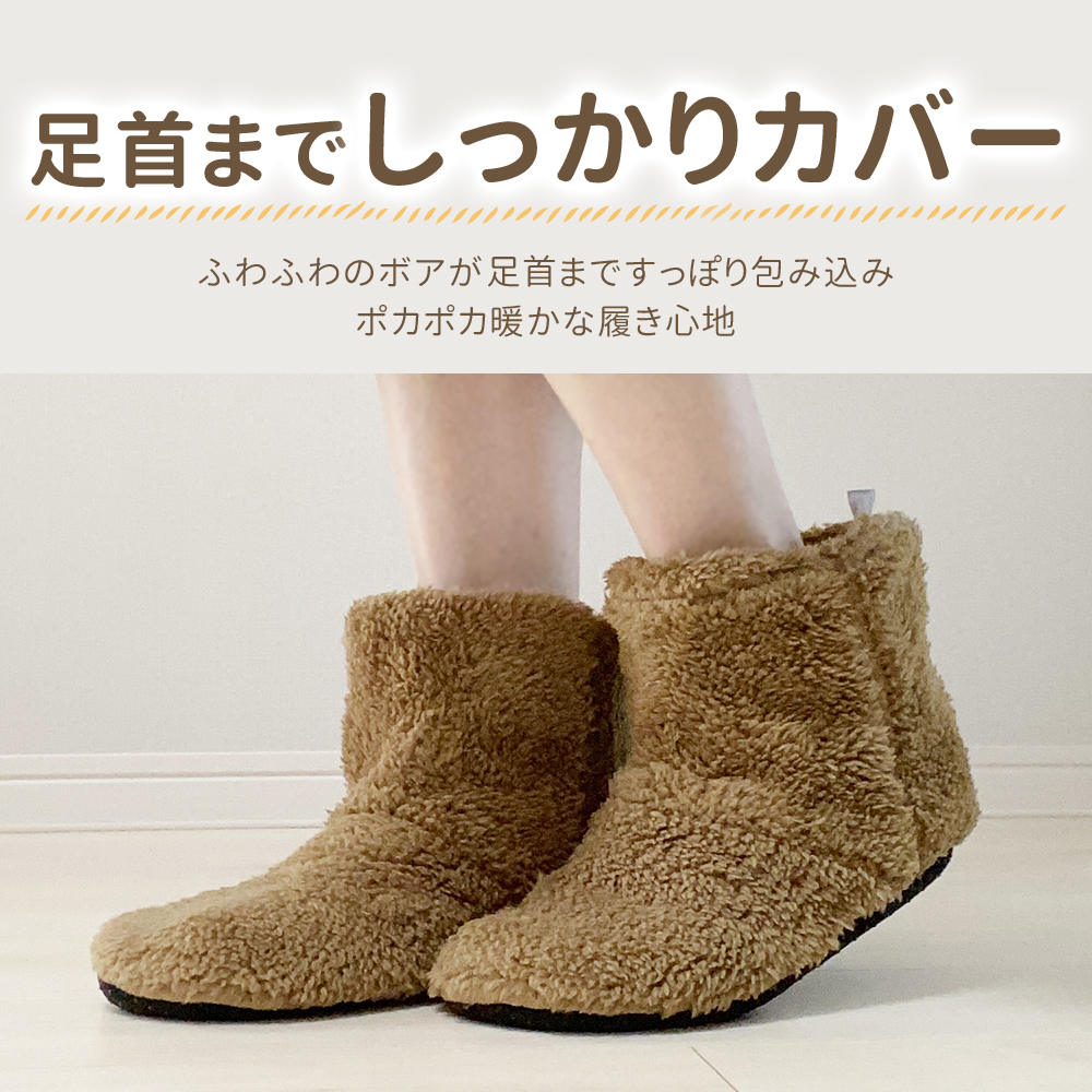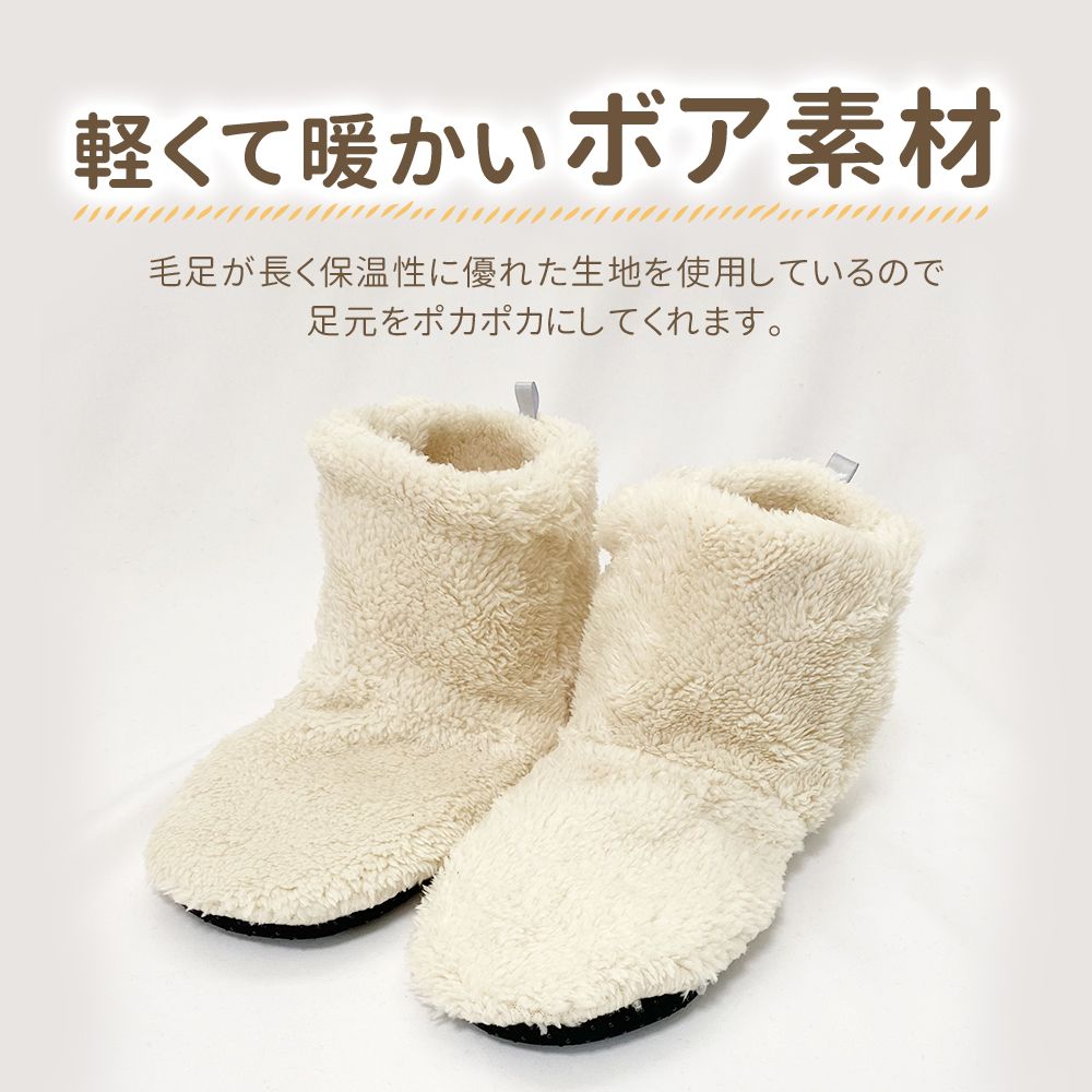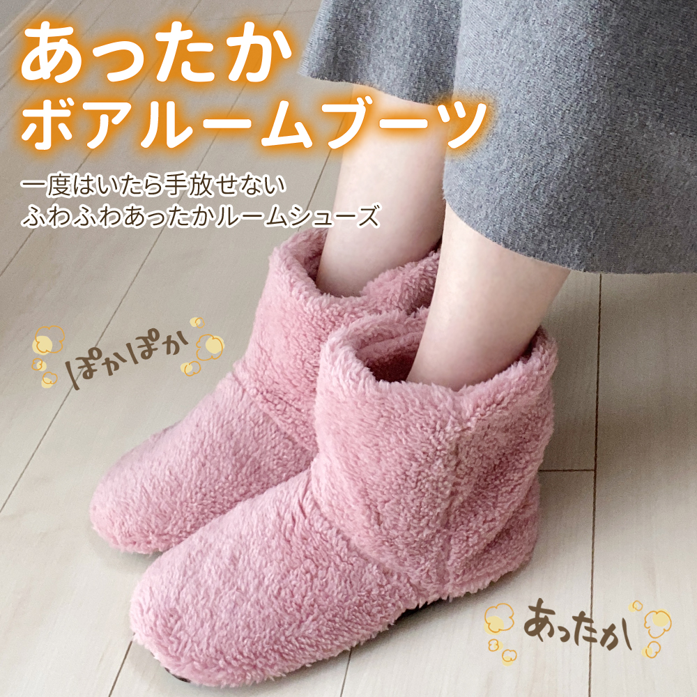 〇足元から来る冷えから対策できるボア素材のルームシューズです。全体がもこもこしているので暖かく、裏はゴムの滑り止めもついているので安心!フリーサイズなので簡単にすっぽり履けます。