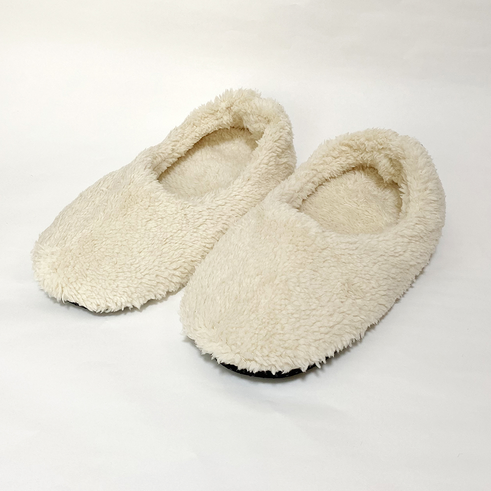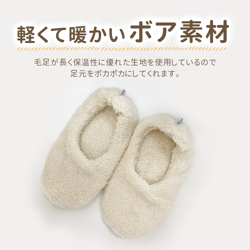 〇足元から来る冷えから対策できるボア素材のルームシューズです。全体がもこもこしているので暖かく、裏はゴムの滑り止めもついているので安心!フリーサイズなので簡単にすっぽり履けます。