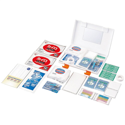 ■25×18×4.5cm専用ケース(鏡付)1個・HIPS樹脂・爪切り・エチケットハサミ・耳かき・毛抜き兼ピンセット・爪ヤスリ・サージカルテープ・ポケットレインコート各1個・キズテープ(M)・コットンパフ各6枚・ガーゼ(中)10枚・カラー綿棒20本・ワンタッチ包帯・マスク・冷却シート・カイロ各2個・(日本・タイ・中国製)