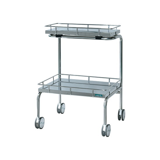 ●下段のものもスムーズに取り出せます。●物品が取り出しやすいユニークな形状のカートです。●棚板手前側の支柱がなく、下段に置いた物が取り出しやすい構造です。●支柱が邪魔にならず、テーブルや作業台の天板を挟みこんでの収納(カンチ式)が可能です。●幅×奥行×高さ:600×450×860 ※高さは天板柵含む●重量(kg):11.2●材質:ステンレス(SUS304)●キャスター:Φ100mmエラストマー製(双輪・対角ストッパー付き)●棚板サイズ:上段/580×250mm、下段/580×410mm●棚間サイズ:378mm●足パイプ径:Φ25mm●カンチ可能テーブル高さ:750mm以下●タグ:院内運搬機器
