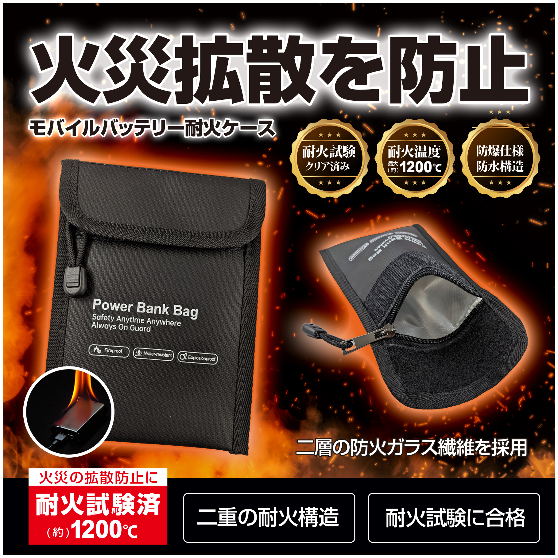 ●二層の防火ガラス繊維を採用し、バッテリー電池の火災拡散を防止し、火災から守る安全設計の商品です。